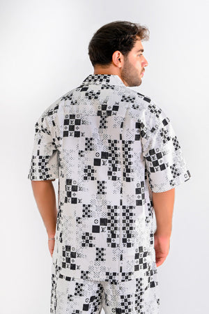 - Design Styles: White & black pixel-style checkerboard print with bold motifs